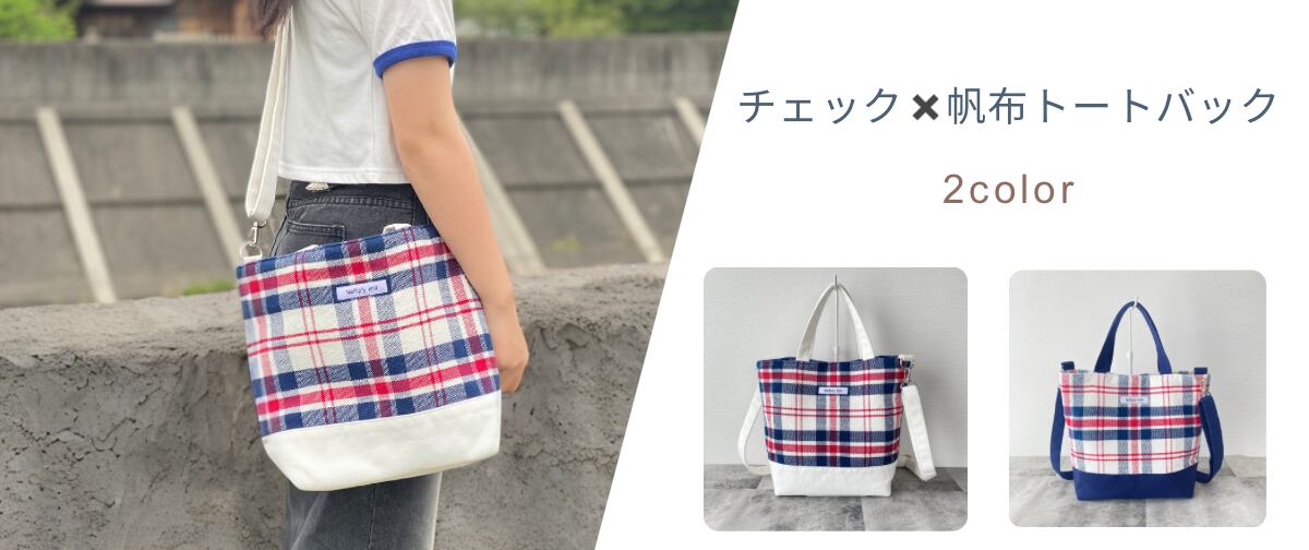 チェック✖️帆布のトートバック(ネイビー) 斜めがけ 2way おしゃれ 大きめ レディース 手織り生地使用 ファスナーポケット・ポケット付き