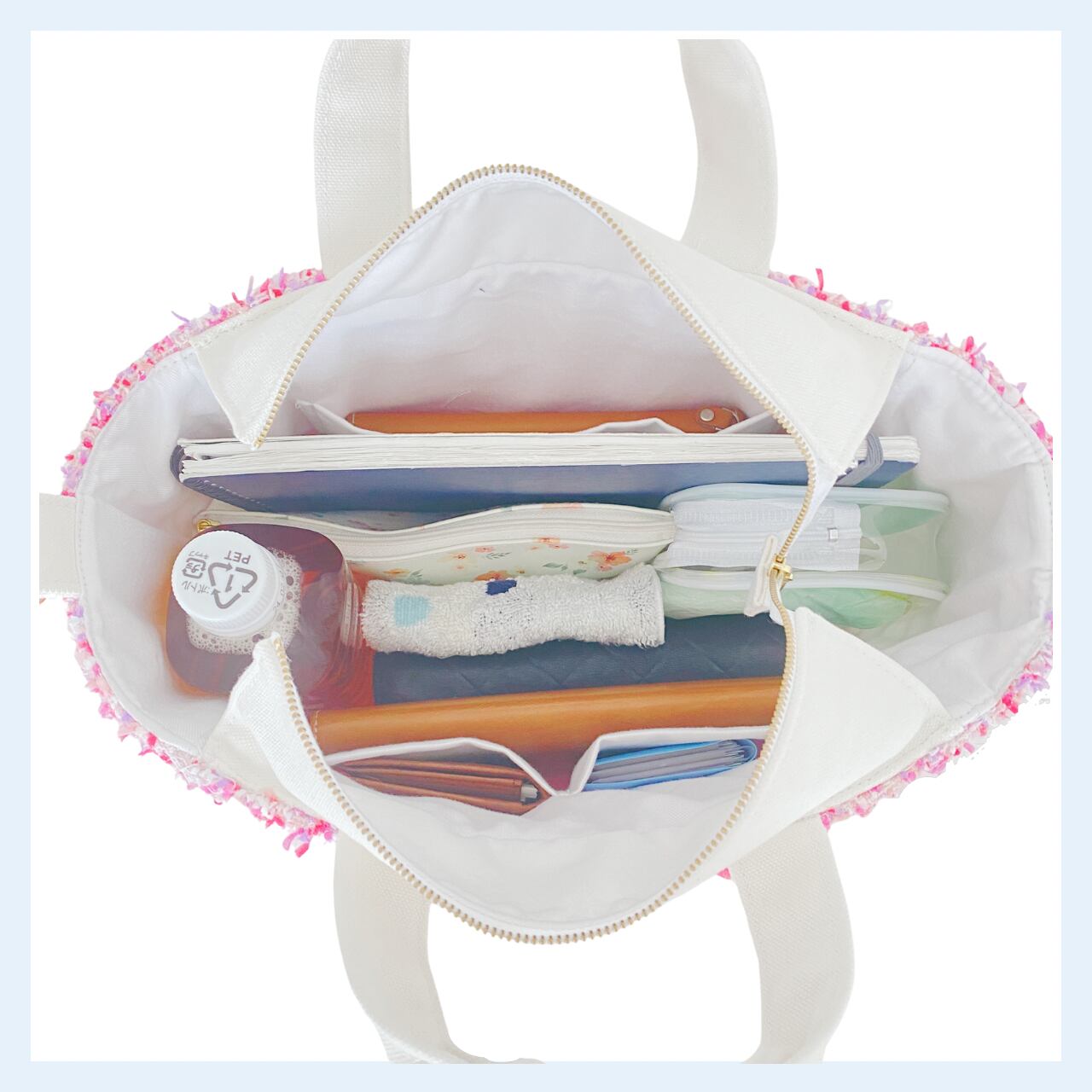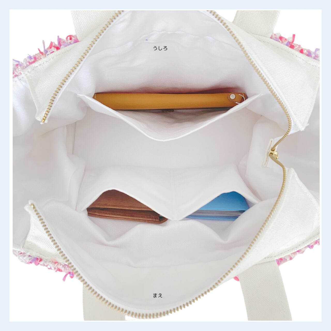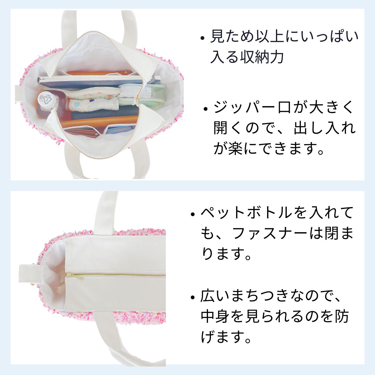 ・持ち手のショルダーバッグ部分を強く引っ張ったり、極端に重い物を入れての使用は破損の原因になりますので、おやめ下さい。